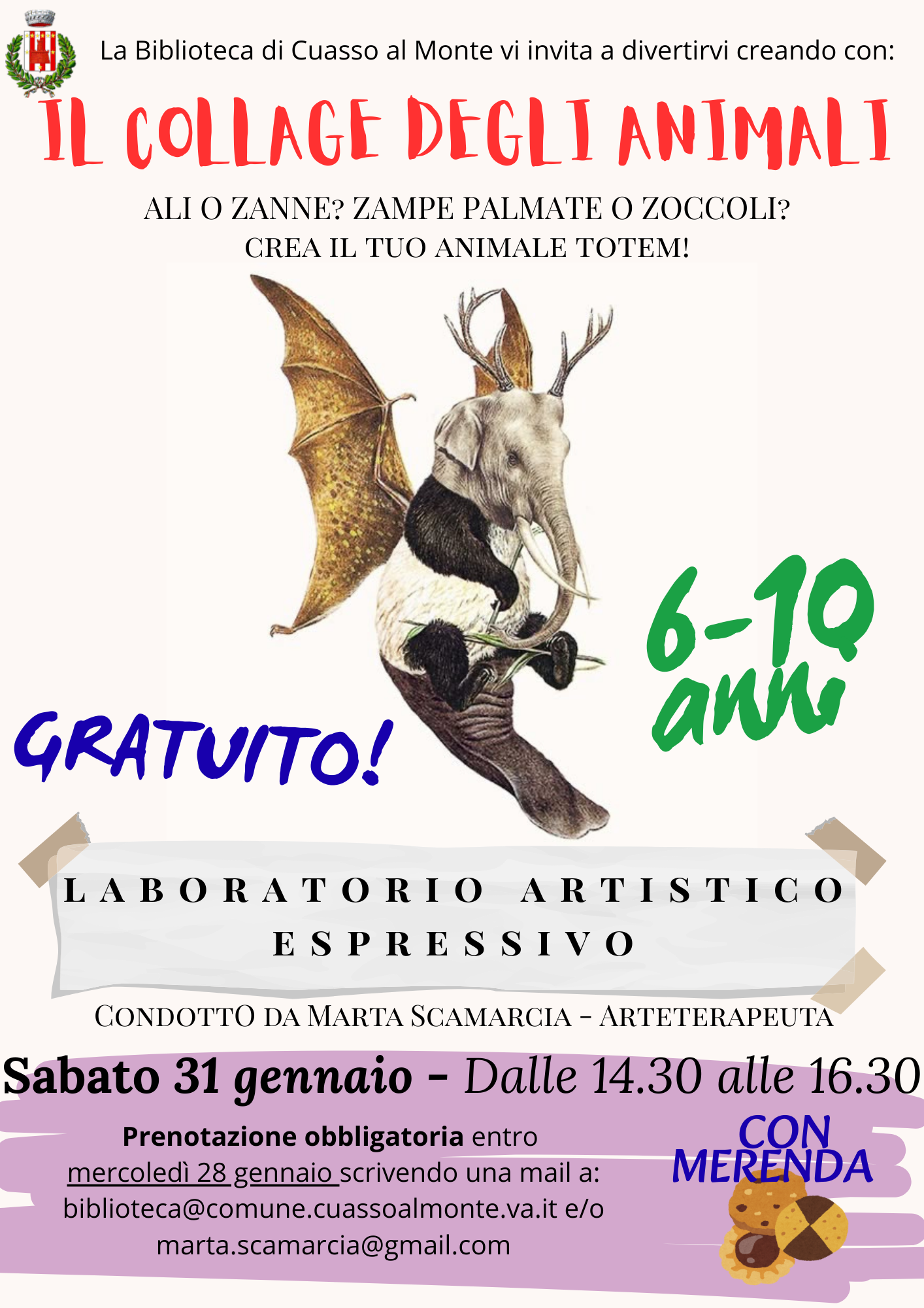 Sabato 31 gennaio dalle 14.30 alle 16.30 IL COLLAGE DEGLI ANIMALI - Laboratorio artistico espressivo a cura di Marta Scamarcia. Questa volta andremo a ritagliare zampe, ali, zanne e zoccoli in cerca del nostro animale totem! Per 6/10 anni, gratuito ma con prenotazione obbligatorio scrivendo una mail a biblioteca@comune.cuassoalmonte.va.it